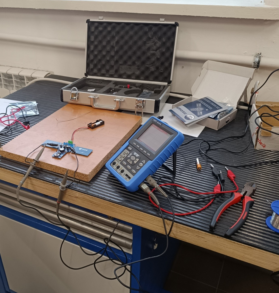 Zmontowane urządzenie zostało wyposażone w funkcję klaskacza oraz klucza telegraficznego, którego zadaniem było generowanie sygnałów w alfabecie Morse’a. Następnym etapem zajęć była weryfikacja poprawności działania generatora sygnału z wykorzystaniem oscyloskopu.